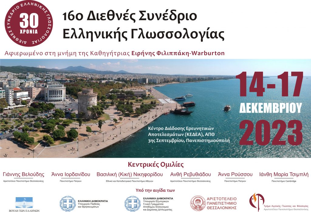 Ο Τομέας Θεωρητικής και Εφαρμοσμένης Γλωσσολογίας του Τμήματος Αγγλικής Γλώσσας και Φιλολογίας του Αριστοτελείου Πανεπιστημίου Θεσσαλονίκης διοργανώσει το επετειακό 16ο Διεθνές Συνέδριο Ελληνικής Γλωσσολογίας (16ο ΔΣΕΓ), το οποίο συμπληρώνει και γιορτάζει τα 30 χρόνια από την πρώτη διοργάνωσή του το 1993, στις 14-17 Δεκεμβρίου 2023 στο Κέντρο Διάδοσης Ερευνητικών Αποτελεσμάτων (ΚΕΔΕΑ) του ΑΠΘ.