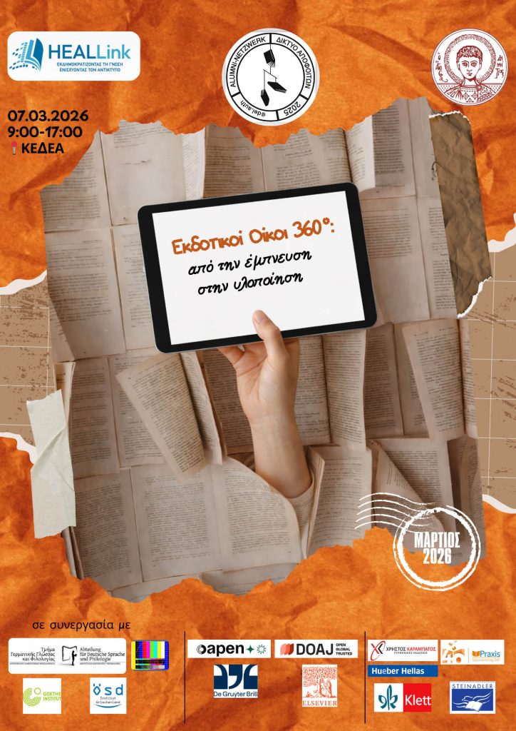 Το Δίκτυο Αποφοίτων του Τμήματος Γερμανικής Γλώσσας και Φιλολογίας του ΑΠΘ, σε συνεργασία με το Πρόγραμμα Μεταπτυχιακών Σπουδών «Διαπολιτισμική Επικοινωνία» μαζί με τον Heal-Link του ΑΠΘ, διοργανώνουν την Ημερίδα «Εκδοτικοί Οίκοι 360o – Aπό την έμπνευση στην υλοποίηση», η οποία θα πραγματοποιηθεί στο αμφιθέατρο Ι του ΚΕΔΕΑ στο ΑΠΘ το Σάββατο 7 Μαρτίου 2026.