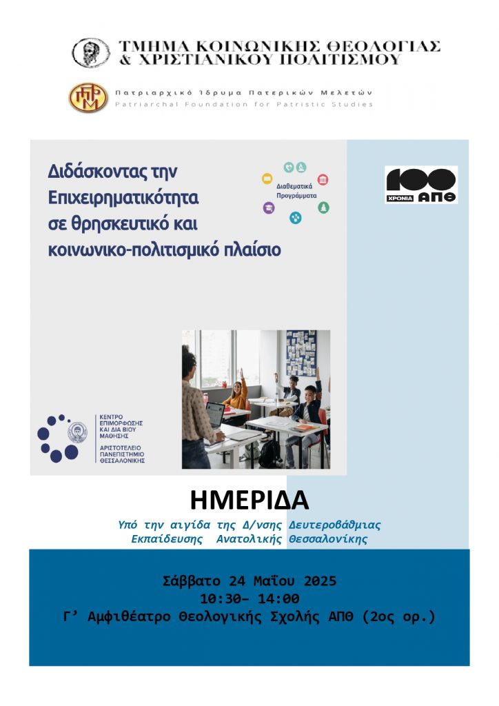 Στο πλαίσιο του εορτασμού των 100 χρόνων ΑΠΘ το Τμήμα Κοινωνικής Θεολογίας και Χριστιανικού Πολιτισμού συμμετέχει ενεργά μέσω του προγράμματος ΚΕΔΙΒΙΜ με τίτλο: «Διδάσκοντας την Επιχειρηματικότητα σε θρησκευτικό και κοινωνικο-πολιτισμικό πλαίσιο», σε συνεργασία με το Πατριαρχικό Ίδρυμα Πατερικών Μελετών (ΠΙΠΜ), υπό την αιγίδα της Δ/νσης Δευτεροβάθμιας Εκπαίδευσης Ανατολικής Θεσσαλονίκης.