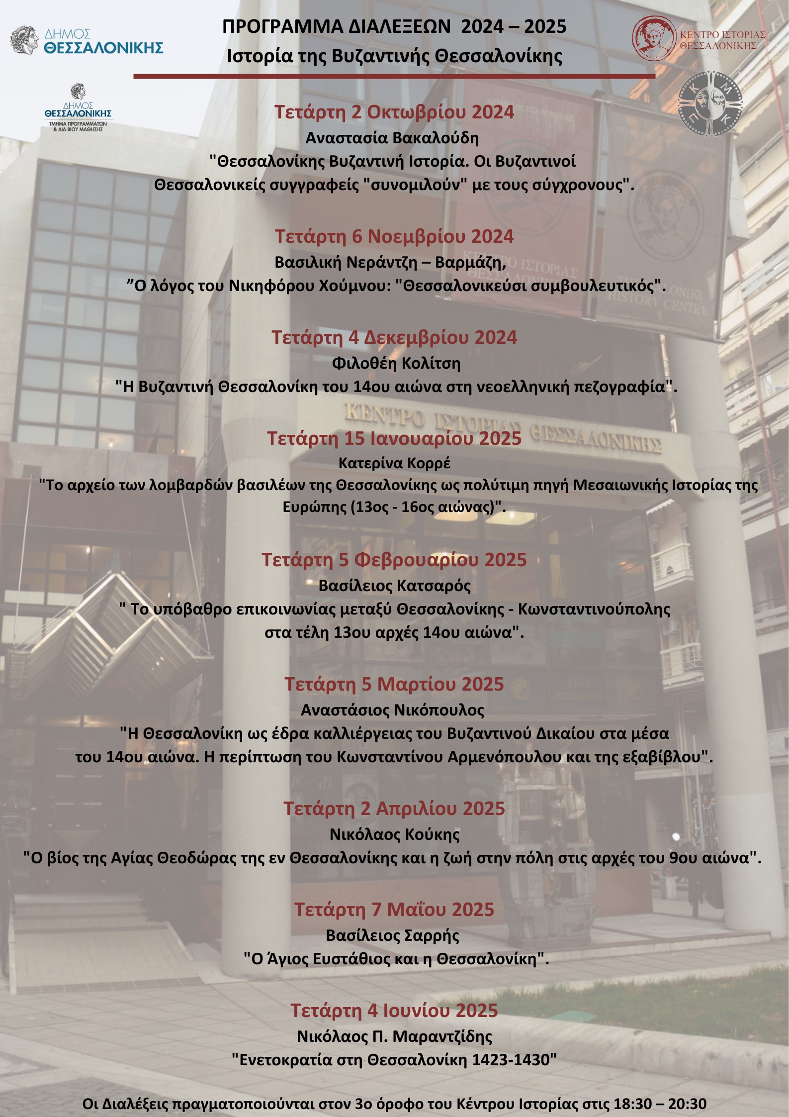 Πρόγραμμα διαλέξεων για τη βυζαντινή ιστορία της Θεσσαλονίκης, ακαδημαϊκού έτους 2024-2025 του Δήμου Θεσσαλονίκης, σε συνεργασία με τον Τομέα Ιστορίας και Αρχαιολογίας της Φιλοσοφικής Σχολής του ΑΠΘ και την Ελληνική Ιστορική Εταιρία.