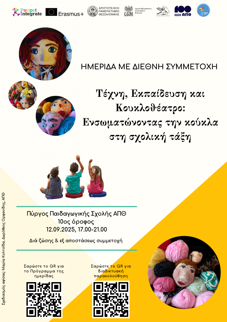 Η Παιδαγωγική Σχολή του Αριστοτελείου Πανεπιστημίου Θεσσαλονίκης σας προσκαλεί στην Τελική Ημερίδα του ευρωπαϊκού έργου PuppetIntegrate – Ενσωμάτωση του κουκλοθέατρου στη σχολική εκπαίδευση για την κοινωνική ένταξη των ευάλωτων και περιθωριοποιημένων ομάδων.