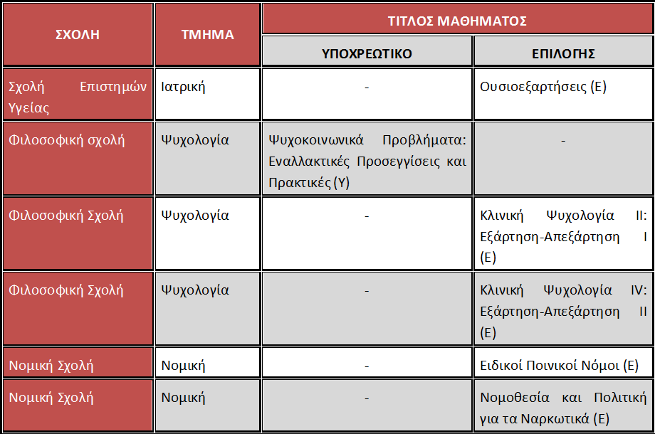 Προσφερόμενα Μαθήματα Σχετικά με την Αντιμετώπιση των Εξαρτήσεων