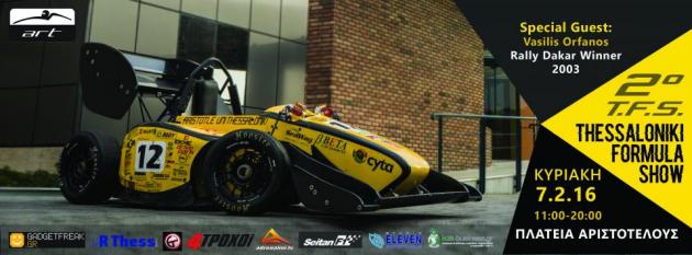 Η φοιτητική ομάδα φόρμουλα Aristotle Racing Team (ART) του ΑΠΘ οργανώνει την Κυριακή 7/2/2016 από τις 11:00 μέχρι τις 20:00 στην πλατεία Αριστοτέλους το 2ο Thessaloniki Formula Show (T.F.S.). Το τελευταίο μονοθέσιο της ομάδας που χάρισε τόσες διακρίσεις στους διεθνείς διαγωνισμούς Formula Student 2014, ανανεωμένο με αεροδυναμικά βοηθήματα, θα πραγματοποιήσει ζωντανή επίδειξη ενώ ο κ. Βασίλης Ορφανός «Rally Dakar-2003 Winner» θα κάνει επίδειξη με τη μηχανή του. Τηλεκατευθυνόμενα Buggies, προσομοιωτής Formula, κληρώσεις, μουσική και άλλα happenings θα πλαισιώνουν την εκδήλωση.