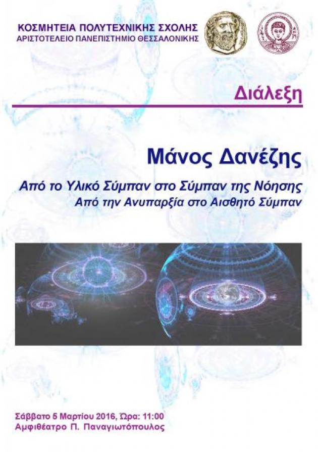 Η Κοσμητεία της Πολυτεχνικής Σχολής του ΑΠΘ διοργανώνει διάλεξη του Μάνου Δανέζη, με θέμα: “Από το Υλικό Σύμπαν στο Σύμπαν της Νόησης” Από την Ανυπαρξία στο Αισθητό Σύμπαν το Σάββατο 5 Μαρτίου 2016 και ώρα 11.00 στο Αμφιθέατρο «Π. Παναγιωτόπουλος» της Πολυτεχνικής Σχολής του ΑΠΘ.