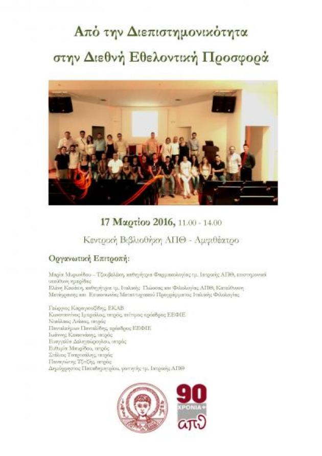 Η Εκδήλωση διοργανώνεται από το Τμήμα Ιταλικής Γλώσσας και Φιλολογίας σε συνεργασία με το Α’ Εργαστήριο Φαρμακολογίας του Τμήματος Ιατρικής και πραγματοποιείται στο πλαίσιο του εορτασμού των 90 χρόνων από την ίδρυση του ΑΠΘ.
