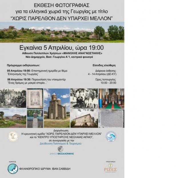 Η ερευνητική ομάδα «Χωρίς παρελθόν δεν υπάρχει μέλλον» και το Κέντρο Υποστήριξης Νεολαίας «Αιγαίο» σε συνεργασία με τη Διεύθυνση Πολιτισμού και Τουρισμού του Δήμου Θεσσαλονίκης σας προσκαλούν στην έκθεση φωτογραφίας με τίτλο «Χωρίς παρελθόν δεν υπάρχει μέλλον» με θέμα τα ελληνικά χωριά της Γεωργίας και τις παράλληλες εκδηλώσεις της.