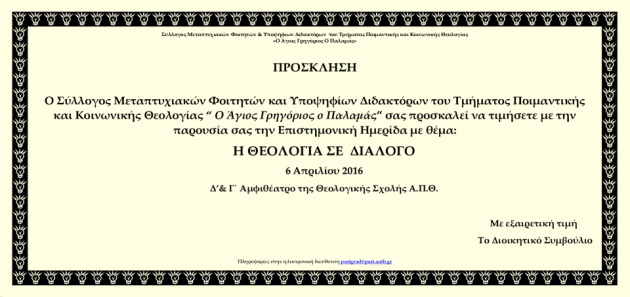 Ο Σύλλογος Μεταπτυχιακών και Υποψηφίων Διδακτόρων του Τμήματος Ποιμαντικής και Κοινωνικής Θεολογίας “O Άγιος Γρηγόριος ο Παλαμάς” διοργανώνει την Τετάρτη΄6 Απριλίου  2016 Επιστημονική Ημερίδα με θέμα “Η Θεολογία σε Διάλογο”.