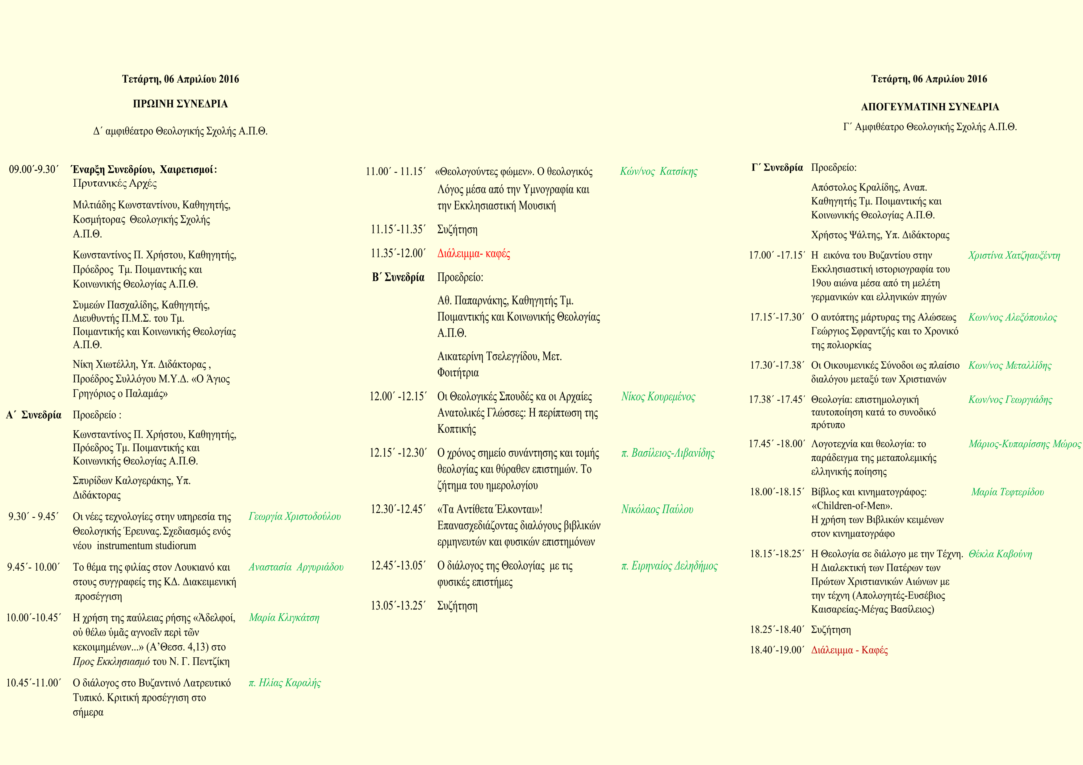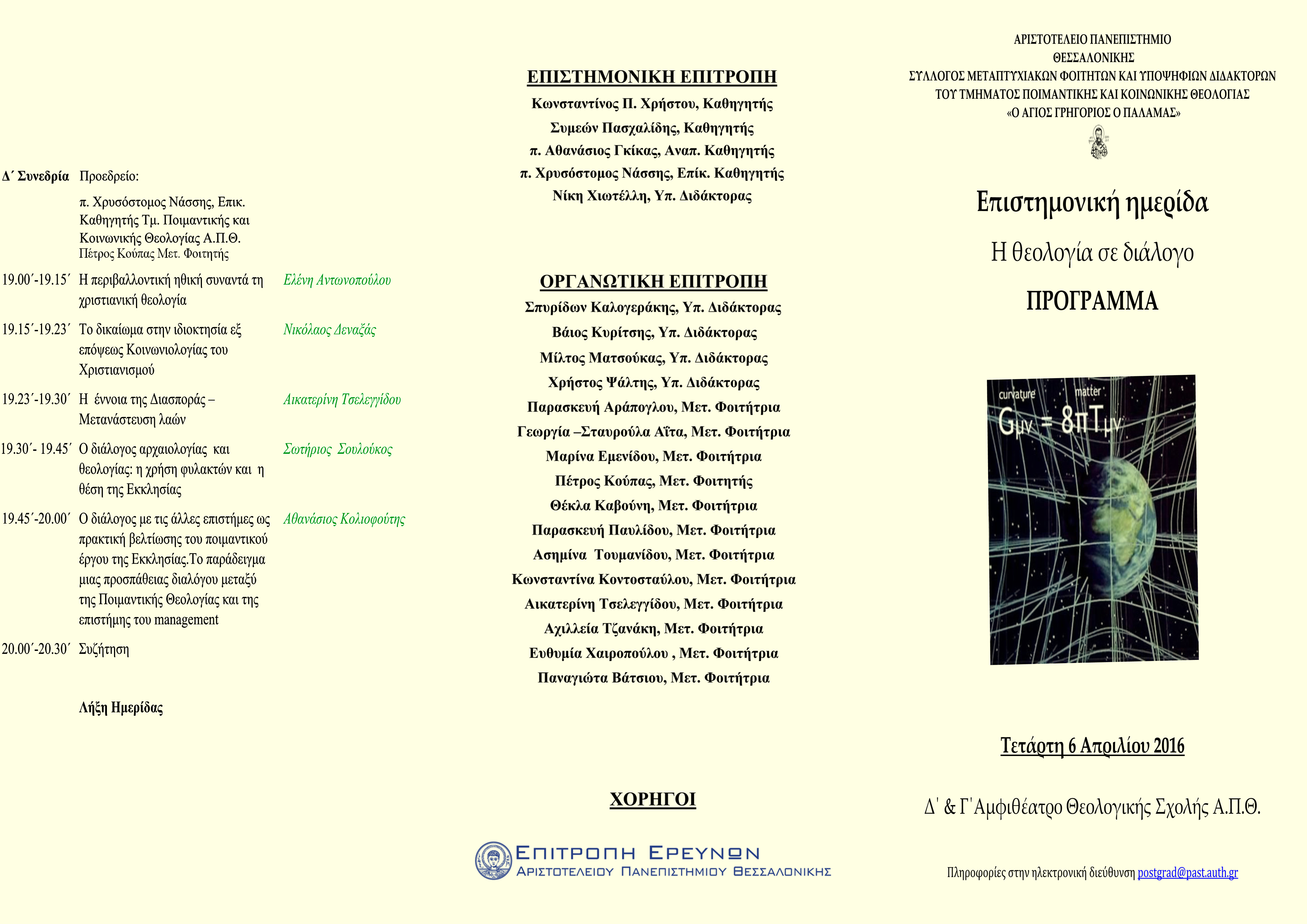 Ο Σύλλογος Μεταπτυχιακών και Υποψηφίων Διδακτόρων του Τμήματος Ποιμαντικής και Κοινωνικής Θεολογίας “O Άγιος Γρηγόριος ο Παλαμάς” διοργανώνει την Τετάρτη΄6 Απριλίου  2016 Επιστημονική Ημερίδα με θέμα “Η Θεολογία σε Διάλογο”.