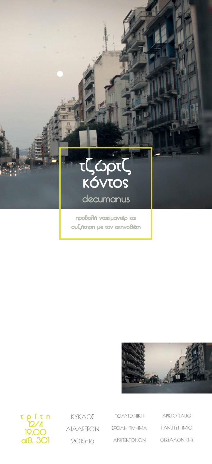 Ο ανεξελεγκτός εκσυγχρονισμός μιας πανάρχαιας πόλης είναι το πλαίσιο αναφοράς για το βίντεο-δοκίμιο του George Kontos, Decumanus. Εμπνευσμένο από το έργο του Aldo Rossi, L’Architettura della Citta, το βίντεο επανεξετάζει το δομημένο περιβάλλον που έχει αντέξει αυτοσχέδιες μορφές ανάπτυξης και έχει ορίσει τον αστικό ιστό τα τελευταία χρόνια. Το Decumanus απεικονίζει ψύχραιμα τις αλλαγές εκφράσεων της Μεσογειακής πολεοδομίας της Θεσσαλονίκης. Προβλήθηκε στο φετινό 18ο Φεστιβάλ Ντοκιμαντέρ Θεσσαλονίκης.