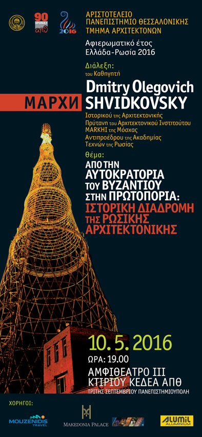 Διάλεξη του Dmitry Οlegovich Shvidkovsky, Πρύτανη του Αρχιτεκτονικού Ινστιτούτου της Μόσχας, με θέμα: “Από την αυτοκρατορία του Βυζαντίου στην Πρωτοπορία. Ιστορική διαδρομή της Ρωσικής Αρχιτεκτονικής”, την Τρίτη 10 Μαϊου 2016 και ώρα 19.00, Αμφιθέατρο ΙΙΙ Κτιρίου ΚΕΔΕΑ ΑΠΘ.