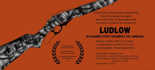 O Τομέας Ανάπτυξης και Προγραμματισμού του Τμήματος Οικονομικών Επιστημών του Αριστοτελείου Πανεπιστημίου Θεσσαλονίκης, σε συνεργασία με τη μη κερδοσκοπική εταιρία «Αποστόλης Μπερδεμπές», ανακοινώνει την προγραμματισμένη προβολή του ντοκιμαντέρ «Ludlow: οι Έλληνες στους Πολέμους του Άνθρακα» την Πέμπτη 19 Μαΐου και ώρα 7.30 μμ στο αμφιθέατρο Α του Κέντρου Διάδοσης Ερευνητικών Αποτελεσμάτων (ΚΕ.Δ.Ε.Α) του ΑΠΘ.