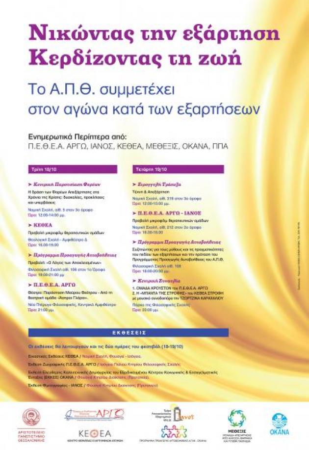 Στα πλαίσια του διήμερου ΝΙΚΩΝΤΑΣ ΤΗΝ ΕΞΑΡΤΗΣΗ – ΚΕΡΔΙΖΟΤΑΣ ΤΗ ΖΩΗ, που διοργανώνεται με πρωτοβουλία του Α.Π.Θ. σε συνεργασία με φορείς απεξάρτησης της πολής μας, θα πραγματοποιηθεί κεντρική εκδήλωση-συζήτηση με θέμα: