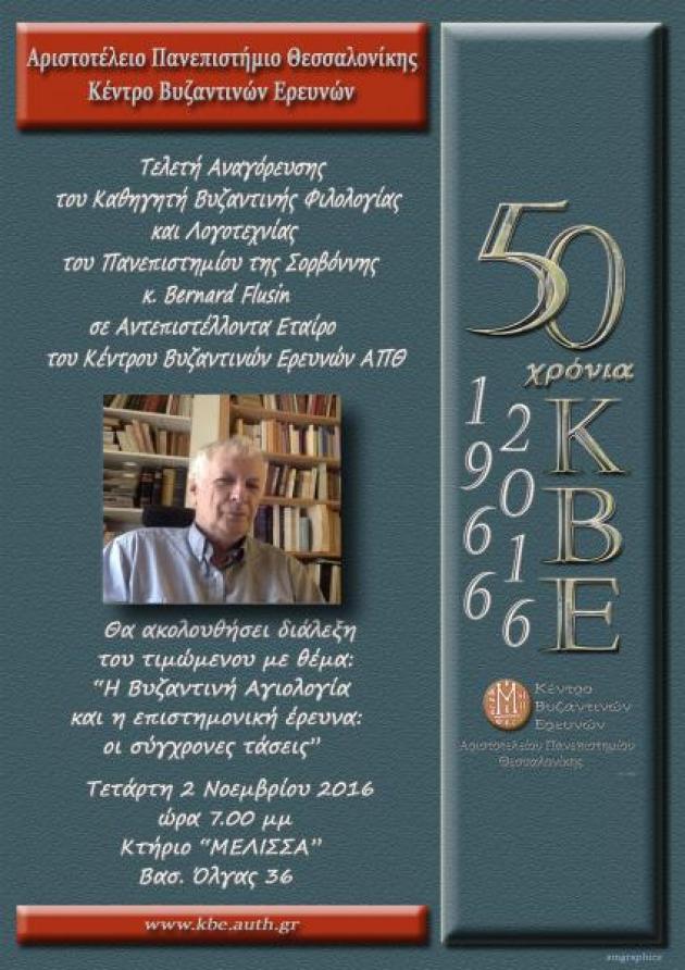 Το Κέντρο Βυζαντινών Ερευνών του Αριστοτέλειου Πανεπιστημίου Θεσσαλονίκης απονέμει τον τίτλο του Αντεπιστέλλοντος Εταίρου σε καταξιωμένους επιστήμονες, πανεπιστημιακούς δασκάλους και ερευνητές, η συμβολή των οποίων στην ανάδειξη, προώθηση και διάδοση του βυζαντινού πολιτισμού έχει αναγνωριστεί διεθνώς ως σημαντική. Στο πλαίσιο αυτό το Δ.Σ. του ΚΒΕ αποφάσισε ομόφωνα να απονείμει τον τίτλο του Αντεπιστέλλοντος Εταίρου στον καθηγητή Bernard Flusin, αναγνωρίζοντας το πολυετές διδακτικό του έργο και την πολύτιμη ερευνητική και συγγραφική συνεισφορά του στην επιστήμη της βυζαντινής φιλολογίας που τον κατατάσσουν διεθνώς ανάμεσα στους πλέον διαπρεπείς βυζαντινολόγους.