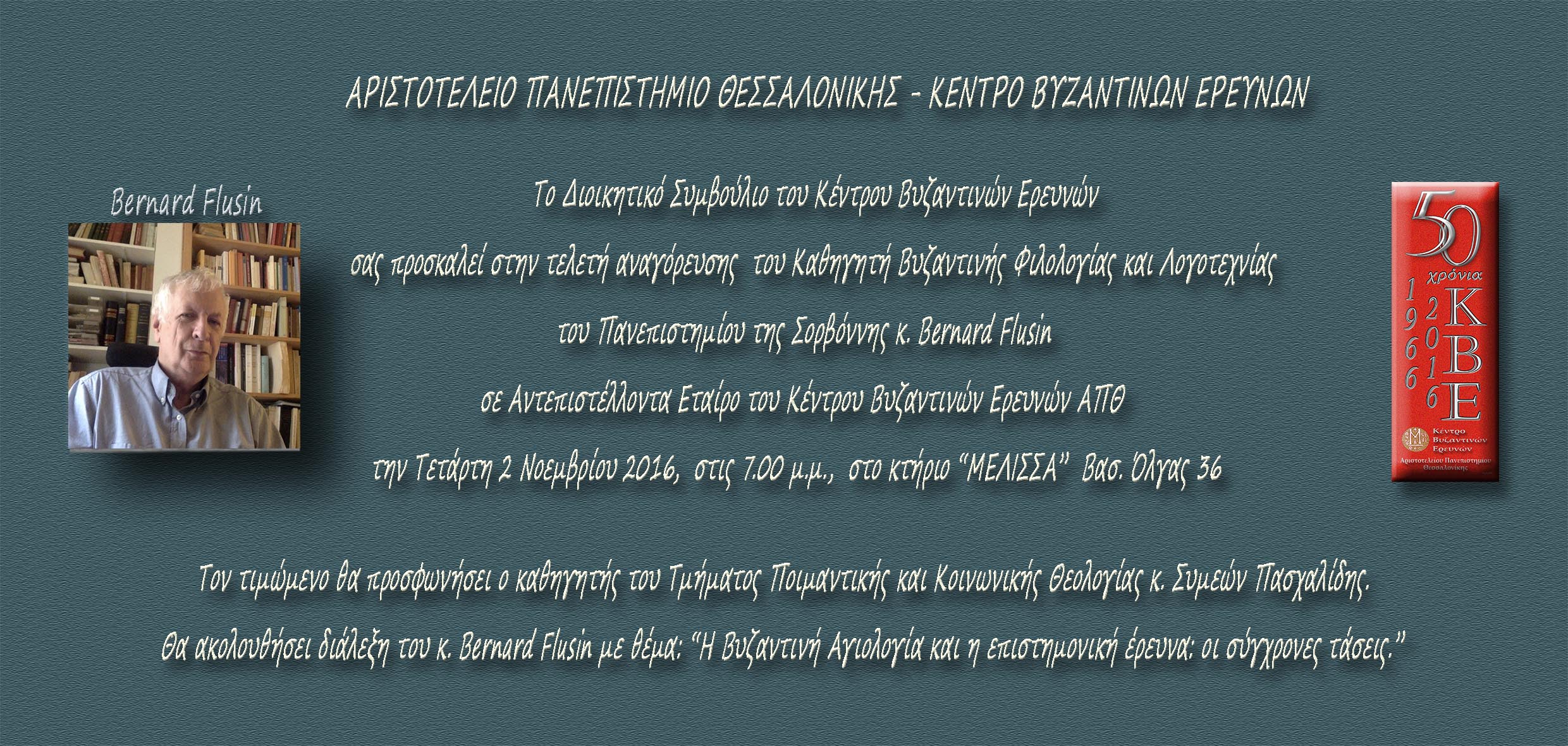 Το Κέντρο Βυζαντινών Ερευνών του Αριστοτέλειου Πανεπιστημίου Θεσσαλονίκης απονέμει τον τίτλο του Αντεπιστέλλοντος Εταίρου σε καταξιωμένους επιστήμονες, πανεπιστημιακούς δασκάλους και ερευνητές, η συμβολή των οποίων στην ανάδειξη, προώθηση και διάδοση του βυζαντινού πολιτισμού έχει αναγνωριστεί διεθνώς ως σημαντική. Στο πλαίσιο αυτό το Δ.Σ. του ΚΒΕ αποφάσισε ομόφωνα να απονείμει τον τίτλο του Αντεπιστέλλοντος Εταίρου στον καθηγητή Bernard Flusin, αναγνωρίζοντας το πολυετές διδακτικό του έργο και την πολύτιμη ερευνητική και συγγραφική συνεισφορά του στην επιστήμη της βυζαντινής φιλολογίας που τον κατατάσσουν διεθνώς ανάμεσα στους πλέον διαπρεπείς βυζαντινολόγους.