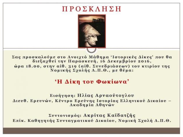 Σας προσκαλούμε στο Ανοιχτό Μάθημα ‘Ιστορικές Δίκες’ που θα διεξαχθεί την Παρασκευή, 2 0 1 6 , ώρα αίθ . 3 1 9 ( αίθ . Συνεδριάσεων) του κτιρίου της Νομικής Σχολής Α.Π.Θ., με θέμα :‘Η Δίκη του Φωκίωνα’
