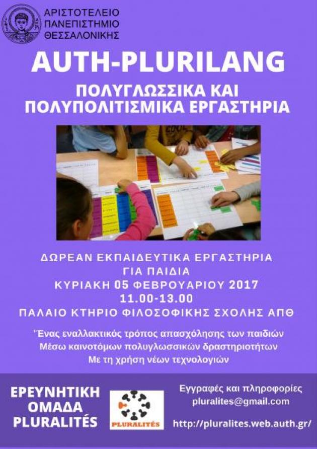 Η ερευνητική ομάδα “Pluralités” του Τμήματος Γαλλικής Γλώσσας και Φιλολογίας του Αριστοτελείου Πανεπιστημίου Θεσσαλονίκης διοργανώνει δωρεάν πολυγλωσσικά και πολυπολιτισμικά εργαστήρια για παιδιά 4-12 ετών. Τα εργαστήρια, διάρκειας 2 ωρών, θα πραγματοποιηθούν την Κυριακή 05 Φεβρουαρίου 2017 από τις 11.00 έως τις 13.00. Στα εργαστήρια αυτά πραγματοποιούνται πολυγλωσσικές και πολυπολιτισμικές δραστηριότητες, οι οποίες εντάσσονται στο πλαίσιο των Πλουραλιστικών Προσεγγίσεων στην Εκπαίδευση του Συμβουλίου της Ευρώπης και βασίζονται στην εμπλοκή διαφόρων γλωσσών και πολιτισμών.
