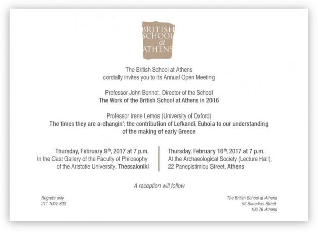 Η εκδήλωση θα πραγματοποιηθεί στις 9 Φεβρουαρίου 2017 στις 7.00μμ. στο Μουσείο Εκμαγείων της Φιλοσοφικής Σχολής του Αριστοτελείου Πανεπιστημίου Θεσσαλονίκης και θα περιλαμβάνει ομιλία του διευθυντή της Βρετανικής Σχολής καθηγητή John Bennet με τίτλο: “The Work of the British School at Athens in 2016” και ομιλία της καθηγήτριας του Πανεπιστημίου της Οξφόρδης Irene Lemos με τίτλο “The times they are a-changin’: the contribution of Lefkandi, Euboia to our understanding of the making of early Greece”.