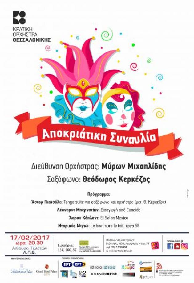 Οι εορτασμοί της αποκριάς έχουν βαθιές ρίζες στην αρχαία Ελλάδα, όπου συνδέονταν με τη λατρεία του Διόνυσου. Στις παγανιστικές διονυσιακές γιορτές οι άνθρωποι μεταμφιέζονταν, χόρευαν, τραγουδούσαν και ξεφάντωναν πίνοντας κρασί, με αποτέλεσμα να εκφράζουν τον ερωτισμό τους πιο ελεύθερα. Η αποκριάτικη συναυλία της Κρατικής Ορχήστρας Θεσσαλονίκης έχει όλα αυτά τα χαρακτηριστικά, όπως τον ερωτισμό του τάνγκο, το πάθος των ξεσηκωτικών μεξικάνικων και βραζιλιάνικων ρυθμών και το μυστήριο των μεταμφιέσεων. Τάνγκο, μπόσα νόβα, τζαζ, σάμπα, μασίζ, πορτογαλέζικο φάντο, παρωδίες κλασικών προτύπων και σουρεαλιστικές αναφορές, συνθέτουν ένα πολύχρωμο και ρυθμικό πρόγραμμα.