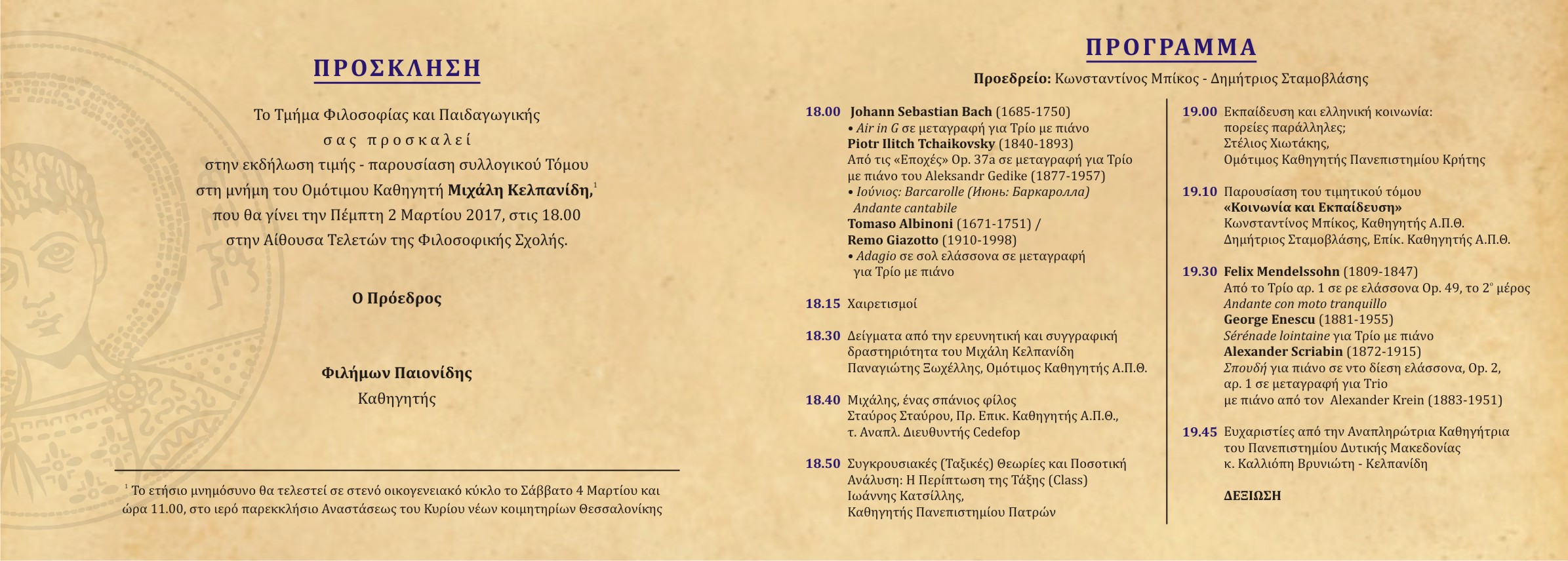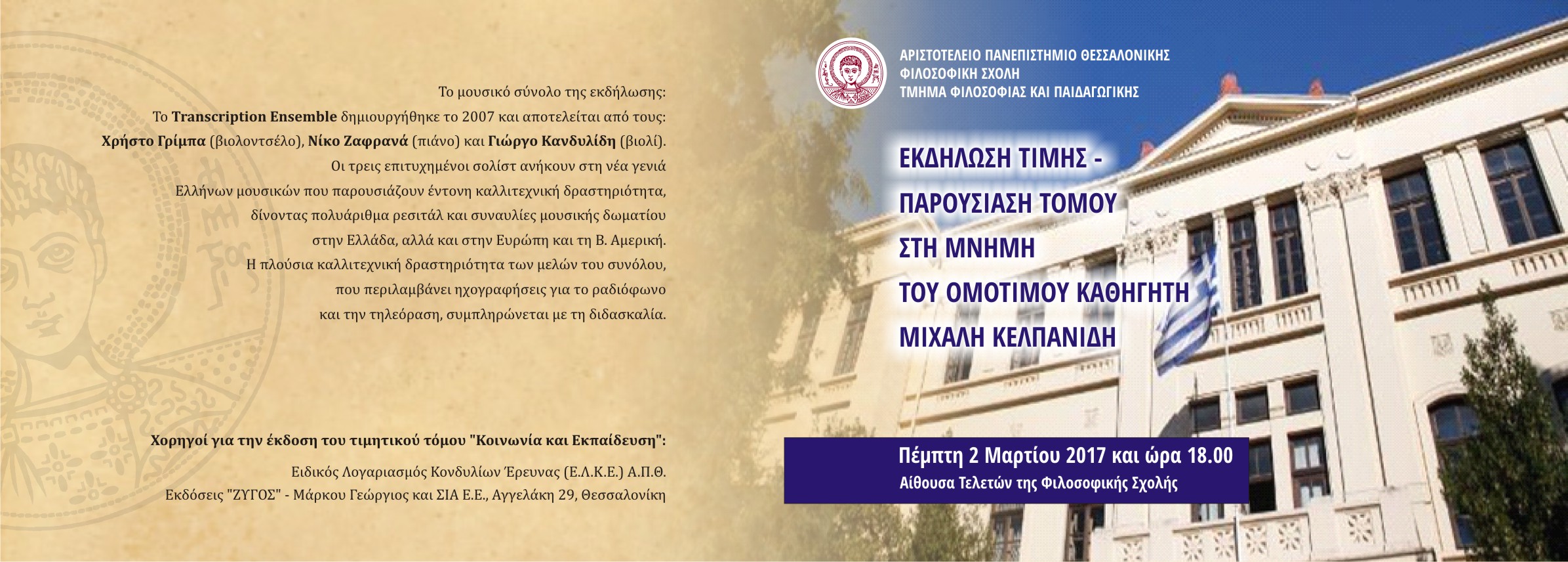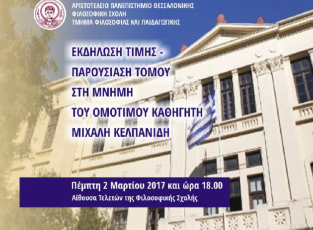 Το Τμήμα Φιλοσοφίας & Παιδαγωγικής της Φιλοσοφικής Σχολής διοργανώνει Εκδήλωση Τιμής-Παρουσίαση Τόμου στη Μνήμη του Ομότιμου Καθηγητή Μιχάλη Κελπανίδη.