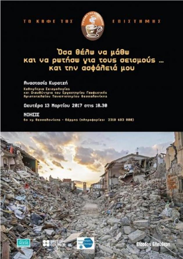 Με τη συνεργασία του Γαλλικού Ινστιτούτου Θεσσαλονίκης, του Βρετανικού Συμβουλίου και του ΝΟΗΣΙΣ συνεχίζεται για δωδέκατη συνεχή χρονιά η πραγματοποίηση των «Καφέ της Επιστήμης», που όπως πάντα, σας προσκαλούν να συζητήσετε με τους ειδικούς επιστημονικά ζητήματα που σας ενδιαφέρουν. Το θέμα του Καφέ της Επιστήμης, δεύτερου καφέ της νέας χρονιάς, αφορά τους σεισμούς στην Ελλάδα, την γειτονική Ιταλία και όχι μόνο.