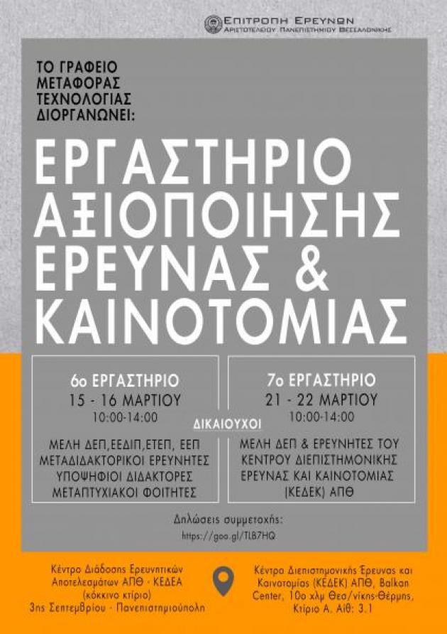Το Γραφείο Μεταφοράς Τεχνολογίας ΑΠΘ, διοργανώνει Εργαστήρια Αξιοποίησης Έρευνας & Καινοτομίας, με στόχο την ενημέρωση/ εκπαίδευση του ερευνητικού δυναμικού σχετικά με τις δυνατότητες αξιοποίησης των ερευνητικών του αποτελεσμάτων.