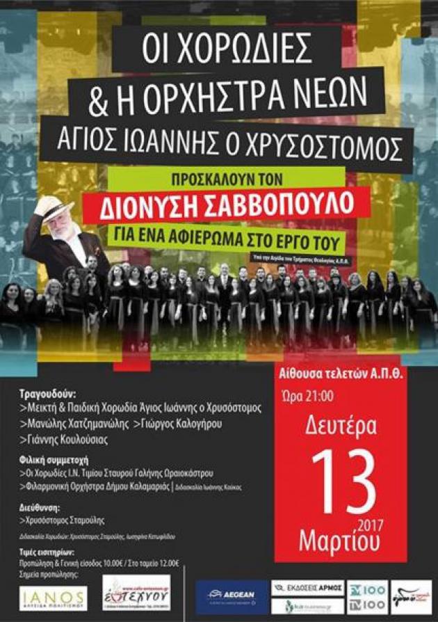 ΟΙ ΧΟΡΩΔΙΕΣ ΚΑΙ Η ΟΡΧΗΣΤΡΑ ΝΕΩΝ ΑΓΙΟΣ ΙΩΑΝΝΗΣ Ο ΧΡΥΣΟΣΤΟΜΟΣ ΠΡΟΣΚΑΛΟΥΝ ΤΟΝ ΔΙΟΝΥΣΗ ΣΑΒΒΟΠΟΥΛΟ ΓΙΑ ΕΝΑ ΑΦΙΕΡΩΜΑ ΣΤΟ ΕΡΓΟ ΤΟΥ