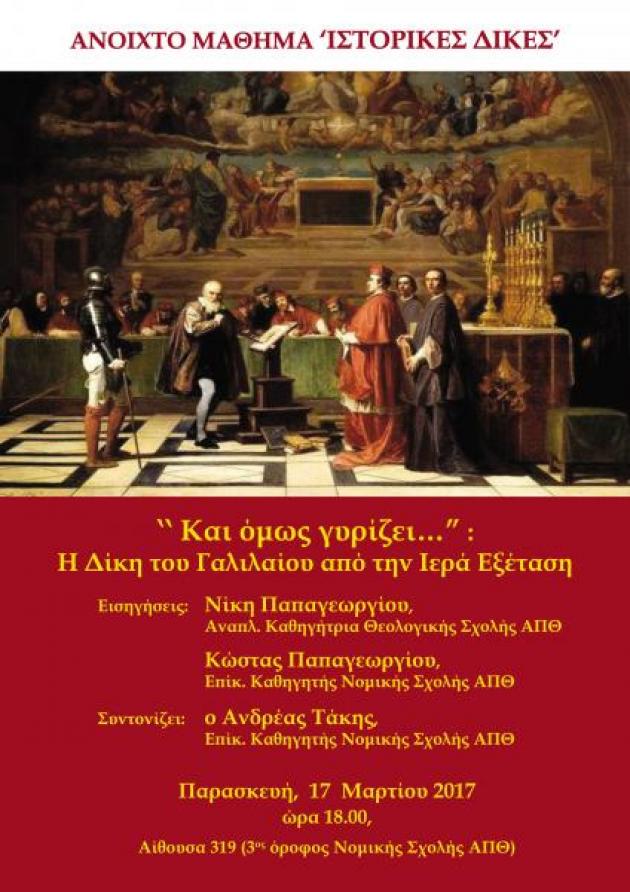 Σας προσκαλούμε στο ανοιχτό μάθημα ‘Ιστορικές Δίκες’ που θα διεξαχθεί την Παρασκευή 17 Μαρτίου 2017, στις 18:00, στην αίθουσα 319, της Νομικής Σχολής του ΑΠΘ με θέμα: