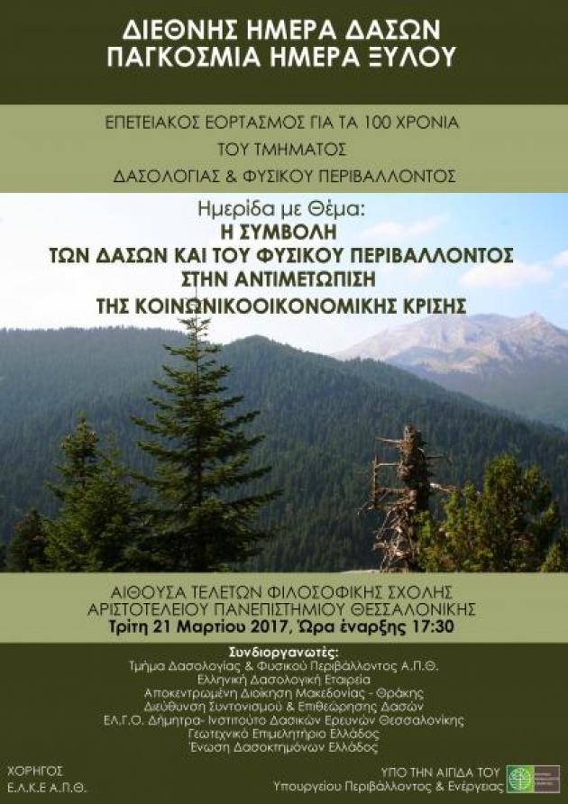 Επετειακή Ημερίδα με την ευκαιρία του Εορτασμού 100 χρόνων του Τμήματος Δασολογίας και Φυσικού Περιβάλλοντος ΑΠΘ και την Παγκόσμια ΗΜΕΡΑ ΔΑΣΩΝ, θα πραγματοποιηθεί στην Αιθουσα Τελετων της Φιλοσοφικής ΑΠΘ, την Τρίτη 21 Μαρτίου 2017, ωρα έναρξης 17.30. σε συνδιοργάνωση με το Τμήμα Δασολογίας και Φυσικού Περιβάλλοντος ΑΠΘ, την Ελληνική Δασολογική Εταιρεία, την Αποκεντρωμένη Διοίκηση Μακεδονίας-Θράκης, τη Δ/νση Συντονισμού και Επιθεώρησης Δασών, το ΕΛΓΟ-ΔΗΜΗΤΡΑ Ινστιτουτο Δασικών Ερευνών Θεσσαλονικης και το ΓΕΩΤΕΧΝΙΚΟ ΕΠΙΜΕΛΗΤΗΡΙΟ ΕΛΛΑΔΟΣ υπο την αιγίδα του Υπουργείου Περιβάλλοντος και Ενέργειας. Χορηγός ΕΛΚΕ ΑΠΘ.