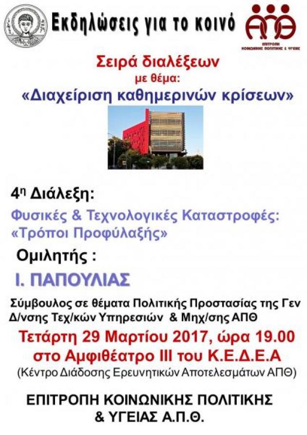 Η Επιτροπή Κοινωνικής Πολιτικής και Υγείας (ΕΚΠΥ) του Α.Π.Θ., υποστηριζόμενη και από τις Πρυτανικές Αρχές του Πανεπιστημίου μας, διοργανώνει, μεταξύ άλλων, μια ειδική σειρά ομιλιών εξειδικευμένων προσώπων πάνω στο αντικείμενο της Διαχείρισης καθημερινών κρίσεων.