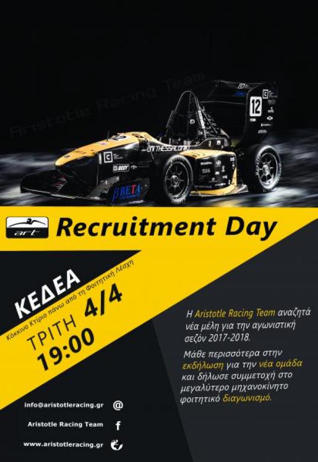 Η Aristotle Racing Team δίνει την ευκαιρία σε νέα μέλη, φοιτητές του Αριστοτέλειου Πανεπιστημίου Θεσσαλονίκης  να στελεχώσουν την ομάδα για την αγωνιστική σεζόν 2017-2018. Είσαι λοιπόν κι εσύ φοιτητής ; Τα μέλη της ομάδας διοργανώνουν ανοιχτή εκδήλωση προς όσους ενδιαφέρονται, την Τρίτη 4 Απριλίου 2017 και ώρα 19:00 στο κτίριο Κ.Ε.Δ.Ε.Α. (κόκκινο κτίριο πάνω από την Πανεπιστημιακή Φοιτητική Λέσχη Α.Π.Θ. , Γ’ Σεπτεμβρίου).