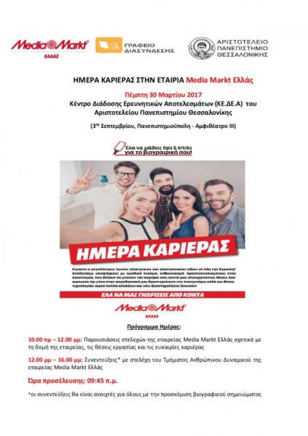 “Ημέρα Καριέρας στην εταιρεία Media Markt Ελλάς” την Πέμπτη 30 Μαρτίου 2017 στις 10.00-16.00 στο Κέντρο Διάδοσης Ερευνητικών Αποτελεσμάτων (ΚΕ.ΔΕ.Α) του Αριστοτελείου Πανεπιστημίου Θεσσαλονίκης (3ης Σεπτεμβρίου, Πανεπιστημιούπολη – Αμφιθέατρο ΙΙΙ)