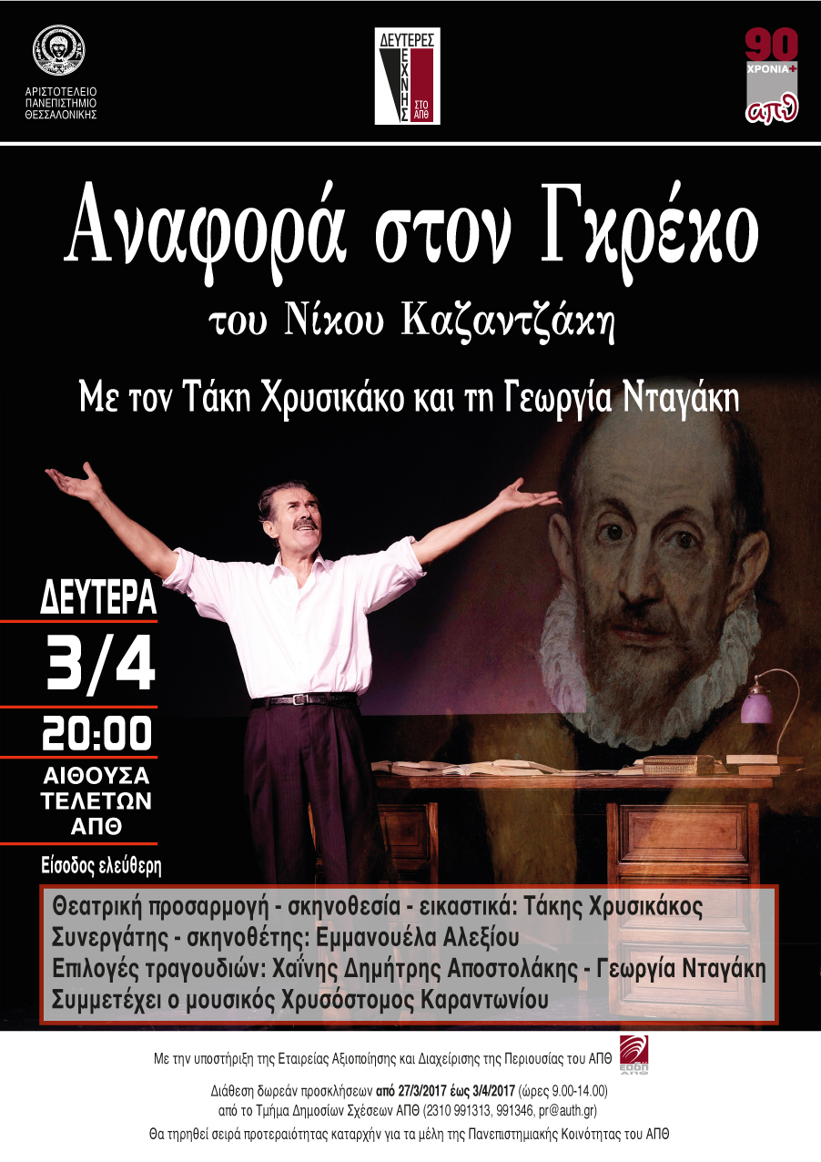 Η παράσταση εντάσσεται στη σειρά εκδηλώσεων με τον γενικό τίτλο «Δευτέρες της Τέχνης στο ΑΠΘ» και παρουσιάζεται στο πλαίσιο του εορτασμού του «Έτους Καζαντζάκη».