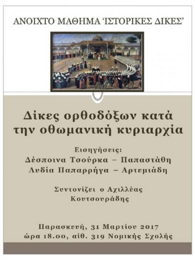 Σας προσκαλούμε στο Ανοιχτό μάθημα ‘Ιστορικές Δίκες’ που θα διεξαχθεί την Παρασκευή 31 Μαρτίου 2017, στις 18:00, στην αίθουσα 319 (αιθ. Συνεδριάσεων) της Νομικής Σχολής ΑΠΘ με θέμα: