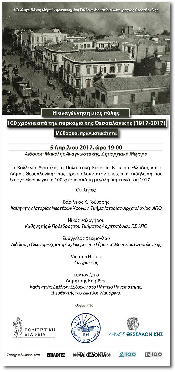 Επετειακή εκδήλωση με τίτλο «Η αναγέννηση μιας πόλης – 100 χρόνια από την πυρκαγιά της Θεσσαλονίκης (1917 – 2017) θα πραγματοποιηθεί την Τετάρτη 5 Απριλίου 2017, στις 7 μ.μ., στην αίθουσα «Μανόλης Αναγνωστάκης» (Δημαρχείο Θεσσαλονίκης, Βασ. Γεωργίου Α΄1).