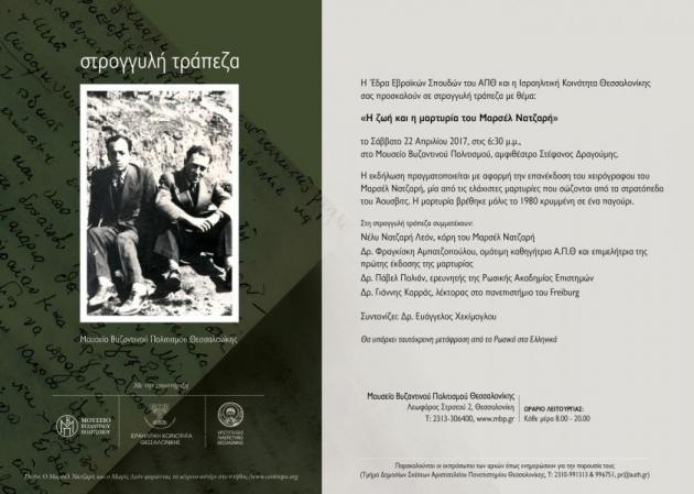Η εκδήλωση πραγματοποιείται με αφορμή την επανέκδοση του χειρόγραφου του Μαρσέλ Νατζαρή, ενός από τα ελάχιστα που βρέθηκαν στα στρατόπεδα. Η μαρτυρία αυτή βρέθηκε μόλις το 1980 κρυμμένη σε ένα παγούρι στο στρατόπεδο Μπίρκεναου.