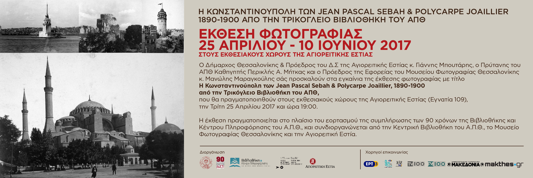 Ο Δήμαρχος Θεσσαλονίκης & Πρόεδρος του Δ.Σ. της Αγιορείτικης Εστίας κ. Γιάννης Μπουτάρης, ο Πρύτανης του ΑΠΘ Καθηγητής Περικλής Μήτκας και ο Πρόεδρος της Εφορείας του Μουσείου Φωτογραφίας Θεσσαλονίκης κ. Μανώλης Μαραγκούλης σάς προσκαλούν στα εγκαίνια της έκθεσης φωτογραφίας με τίτλο