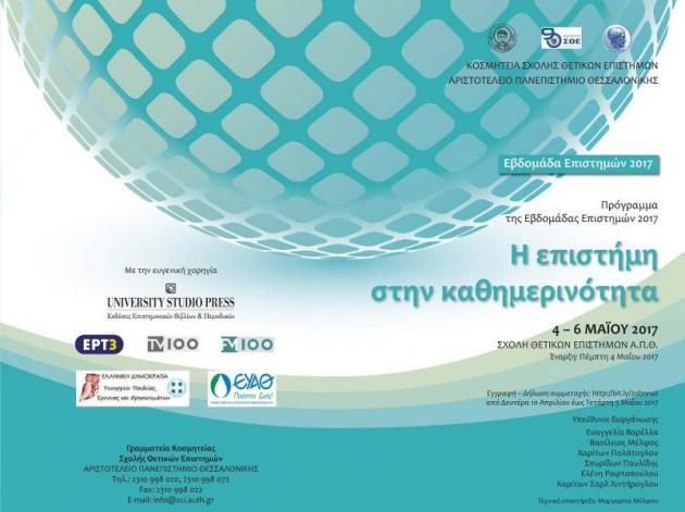 Η Κοσμητεία της Σχολής Θετικών Επιστημών, στο πλαίσιο εορτασμού των 90 χρόνων της Σχολής, διοργανώνει Εβδομάδα Επιστημών με θέμα “Η επιστήμη στην καθημερινότητα” από 4 έως 6 Μαϊου 2017.