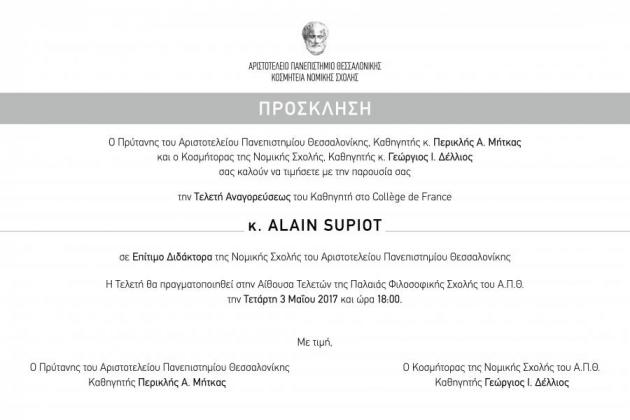 Θα βρείτε συνημμένη την πρόσκληση και το πρόγραμμα της αναγόρευσης σε επίτιμο Διδάκτορα της Νομικής Σχολής ΑΠΘ του κ. Alain Supiot, καθηγητή του Collège de France. Η τελετή θα λάβει χώρα την Τετάρτη 3 Μαΐου 2017 στις 18:00 στην αίθουσα τελετών της Παλαιάς Φιλοσοφικής Σχολής του ΑΠΘ.