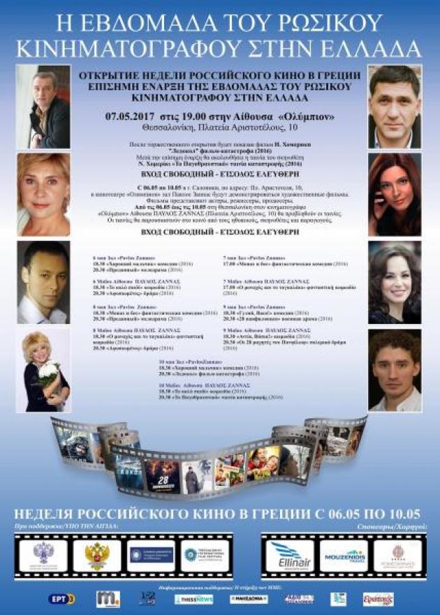 Από τις 6 έως 10 Μαΐου, θα διεξαχθεί η «Εβδομάδα ρωσικού κινηματογράφου στην Ελλάδα».με τη στήριξη του Υπουργείου Πολιτισμού της Ρωσικής Ομοσπονδίας, του Υπουργείου Εξωτερικών Ελλάδας, του Υπουργείου Πολιτισμού της Ελλάδας, της Πρεσβείας της Ρωσίας στην Ελλάδα, του Γενικού Προξενείου της Ρωσίας στη Θεσσαλονίκη και του Φεστιβάλ Κινηματογράφου Θεσσαλονίκης.