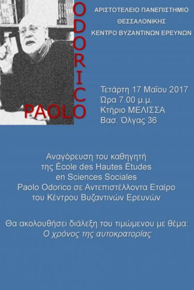 Ο κ. Paolo Odorico είναι καθηγητής της λογοτεχνίας και της ιστορίας του πολιτισμού του βυζαντινού και νεοελληνικού κόσμου και της ΝΑ Ευρώπης και διευθυντής σπουδών στην École des Ηautes Études en Sciences Sociales.