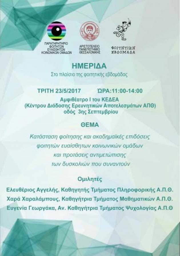 Ημερίδα: ”Κατάσταση φοίτησης και ακαδημαϊκές επιδόσεις φοιτητών ευαίσθητων κοινωνικών ομάδων και προτάσεις αντιμετώπισης των δυσκολιών που συναντούν”