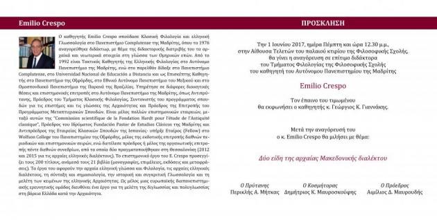 Ο καθηγητής Emilio Crespo σπούδασε Kλασική Φιλολογία και ελληνική Γλωσσολογία στο Πανεπιστήμιο Complutense της Μαδρίτης, όπου το 1976 αναγορεύθηκε διδάκτωρ, με θέμα της διδακτορικής διατριβής του τα αρχαϊκά και νεωτερικά στοιχεία στη γλώσσα των Oμηρικών επών. Από το 1992 είναι Τακτικός Καθηγητής της Ελληνικής Φιλολογίας στο Αυτόνομο Πανεπιστήμιο της Μαδρίτης, ενώ στο παρελθόν δίδαξε στο Πανεπιστήμιο Complutense, στο Universidad Nacional de Educación a Distancia και ως Επισκέπτης Καθηγητής στο Πανεπιστήμιο της Οξφόρδης, στο Εθνικό Αυτόνομο Πανεπιστήμιο του Μεξικού και στο Ομοσπονδιακό Πανεπιστήμιο της Παρανά της Βραζιλίας. Υπηρέτησε σε διάφορες διοικητικές θέσεις και επιστημονικές επιτροπές στο Αυτόνομο Πανεπιστήμιο της Μαδρίτης, όπως Αντιπρύτανης, Πρόεδρος του Τμήματος Κλασικής Φιλολογίας, Συντονιστής του προγράμματος σπουδών για τις επιστήμες και τις γλώσσες της αρχαιότητας και Πρόεδρος της Επιτροπής του Προγράμματος Μεταπτυχιακών Σπουδών. Είναι μέλος πολλών επιστημονικών εταιρειών, μεταξύ αυτών της “Commission scientifique de la Fondation Hardt pour l’étude de l’Antiquité classique”, Πρόεδρος του Ιδρύματος Fundación Pastor de Estudios Clásicos της Μαδρίτης και Αντιπρόεδρος της Εταιρείας Κλασικών Σπουδών της Ισπανίας· υπήρξε Εταίρος (Fellow) στο Wolfson College του Πανεπιστημίου της Οξφόρδης, μέλος της εκδοτικής επιτροπής διεθνών περιοδικών και επιστημονικών σειρών, ενώ διετέλεσε πρόεδρος ή μέλος της οργανωτικής επιτροπής πέντε διεθνών συνεδρίων, δύο από τα οποία πραγματοποιήθηκαν στη Θεσσαλονίκη (2012 και 2015 για τις αρχαίες ελληνικές διαλέκτους). Το επιστημονικό έργο του E. Crespo προσεγγίζει τους 200 τίτλους, ανάμεσά τους 21 βιβλία (μονογραφίες, επιμέλειες, εκδόσεις και μεταφράσεις). Τα έργα του αφορούν την αρχαία ελληνική γλώσσα και φιλολογία, τις αρχαίες ελληνικές διαλέκτους, τη σύνταξη και σημασιολογία, την ιστορική και συγκριτική γλωσσολογία και τη μελέτη των κειμένων της ελληνικής αρχαιότητας. Ως μέλος μιας ευρωπαϊκής διαπανεπιστημιακής ερευνητικής ομάδας διευθύνει ένα έργο για τη μελέτη της διγλωσσίας και πολυγλωσσίας στη βόρεια Ελλάδα κατά την Aρχαιότητα.