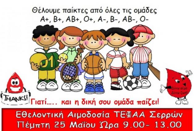 Tο Τμήμα Επιστήμης Φυσικής Αγωγής και Αθλητισμού Σερρών (Τ.Ε.Φ.Α.Α.) της Σχολής Επιστήμης Φυσικής Αγωγής και Αθλητισμού (Σ.Ε.Φ.Α.Α.) του Α.Π.Θ., στο πλαίσιο διεξαγωγής των καθιερωμένων ημερών εθελοντικής αιμοδοσίας, διοργανώνει εθελοντική αιμοδοσία, την Πέμπτη 25 Μαΐου 2017. Η κινητή μονάδα του σταθμού αιμοδοσίας του Γενικού Νοσοκομείου θα βρίσκεται στο Τ.Ε.Φ.Α.Α., κτίριο Διδακτηρίου, στον Άγιο Ιωάννη από τις 09:00 έως τις 13:00.