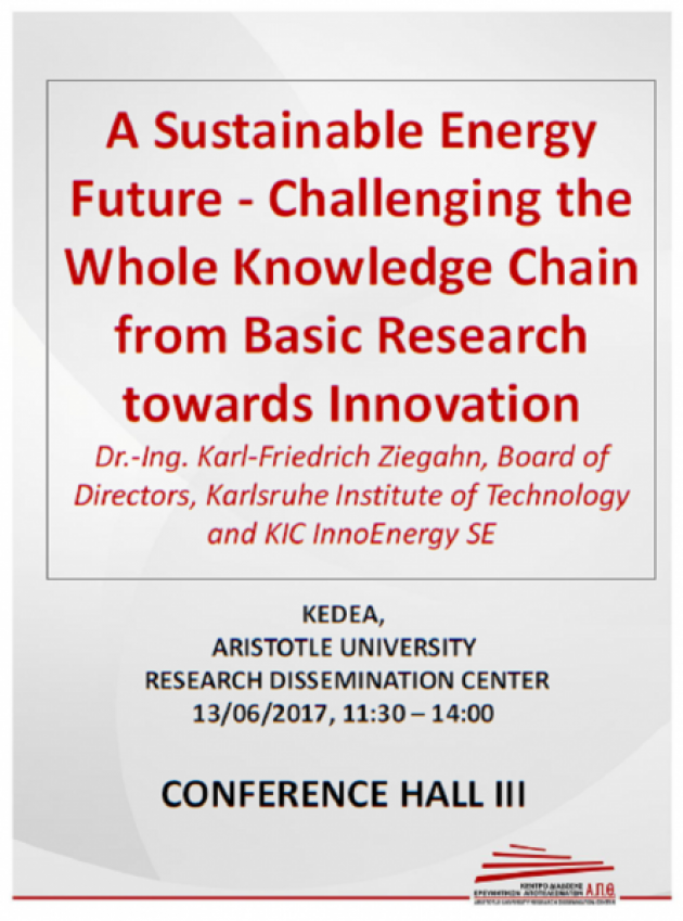 Ο Ενεργειακός Τομέας του Τμήματος Μηχανολόγων Μηχανικών σε συνεργασία με την Πρυτανεία, διοργανώνει, την Τρίτη 13 Ιουνίου 2017, διάλεξη του Dr. Karl-Friedrich Ziegahn, μέλους του Διοικητικού Συμβουλίου του Ινστιτούτου Τεχνολογίας της Καρλσρούης της Γερμανίας, με θέμα: