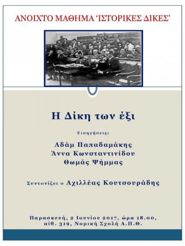 Σας προσκαλούμε στο Ανοιχτό Μάθημα ΙΣΤΟΡΙΚΕΣ ΔΙΚΕΣ που θα διεξαχθεί την Παρασκευή, 2 Ιουνίου 2017, ώρα 18.00, στην αίθ. 319 της Νομικής Σχολής Α.Π.Θ., με θέμα: ‘Η Δίκη των έξι’