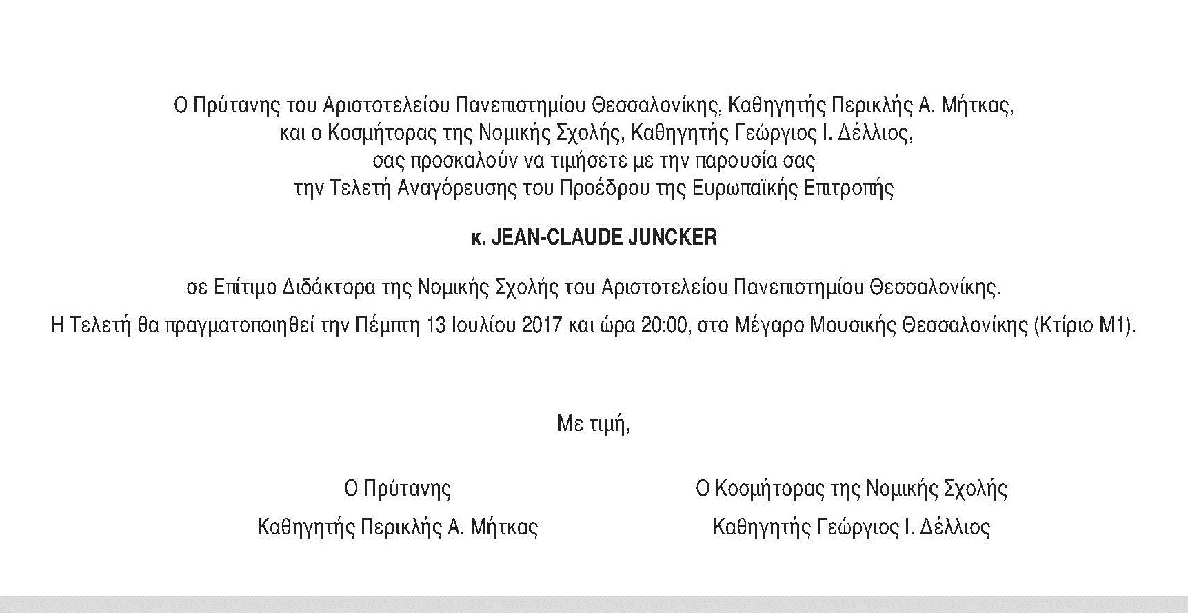 σας προσκαλούν να τιμήσετε με την παρουσία σας την Τελετή Αναγόρευσης του Προέδρου της Ευρωπαϊκής Επιτροπής