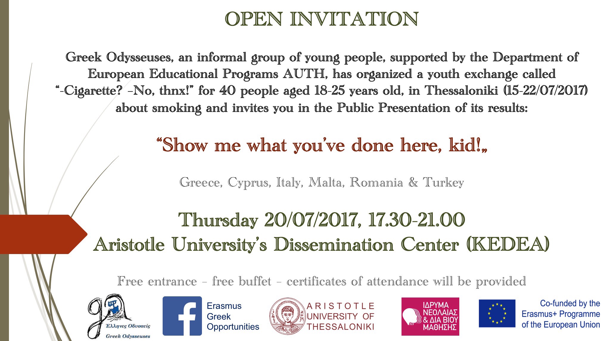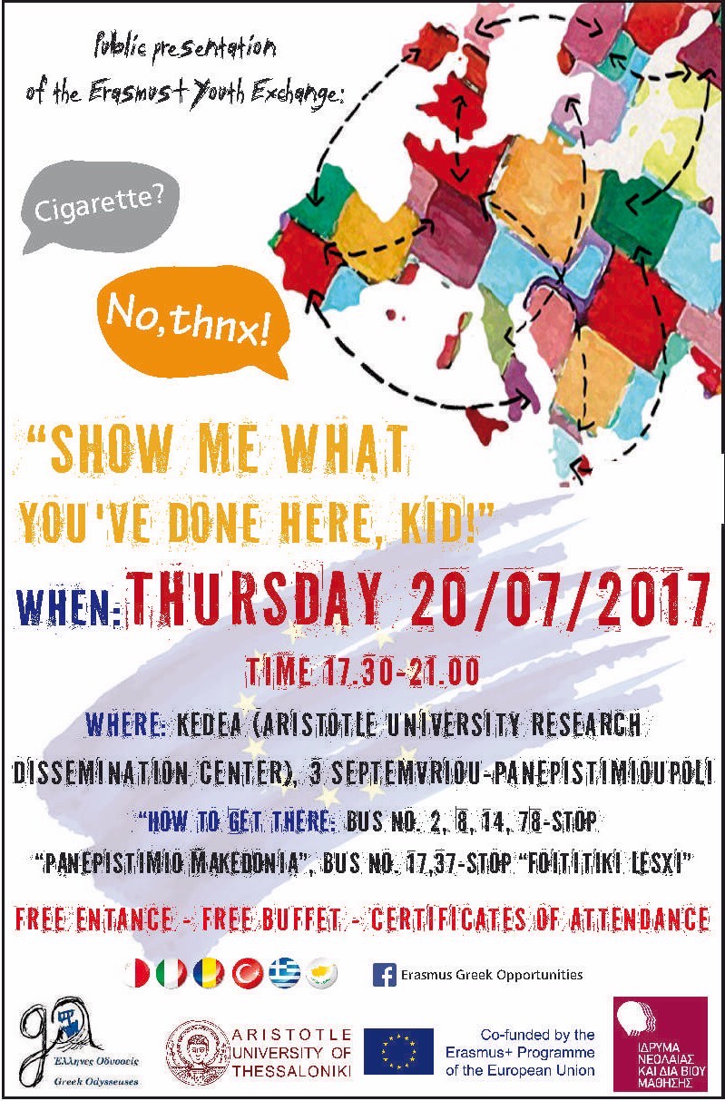 Στo πλαίσιo της Ευρωπαϊκής Ανταλλαγής Νέων (15-22/07/2017) “-Cigarette?-No,thnx!” η ομάδα νέων Έλληνες Οδυσσείς (Greek Odysseuses G.O.) σας προσκαλεί σε μια ανοικτή δράση στη Θεσσαλονίκη απευθυνόμενη σε κάθε ενδιαφερόμενο νέο την Πέμπτη 20/07//2017 17:30 με 21:00 με την υποστήριξη του Ι.Νε.Δι.Βι.Μ., του Τμήματος Ευρωπαϊκών Εκπαιδευτικών Προγραμμάτων του Αριστοτελείου Πανεπιστημίου Θεσσαλονίκης και του Erasmus+.