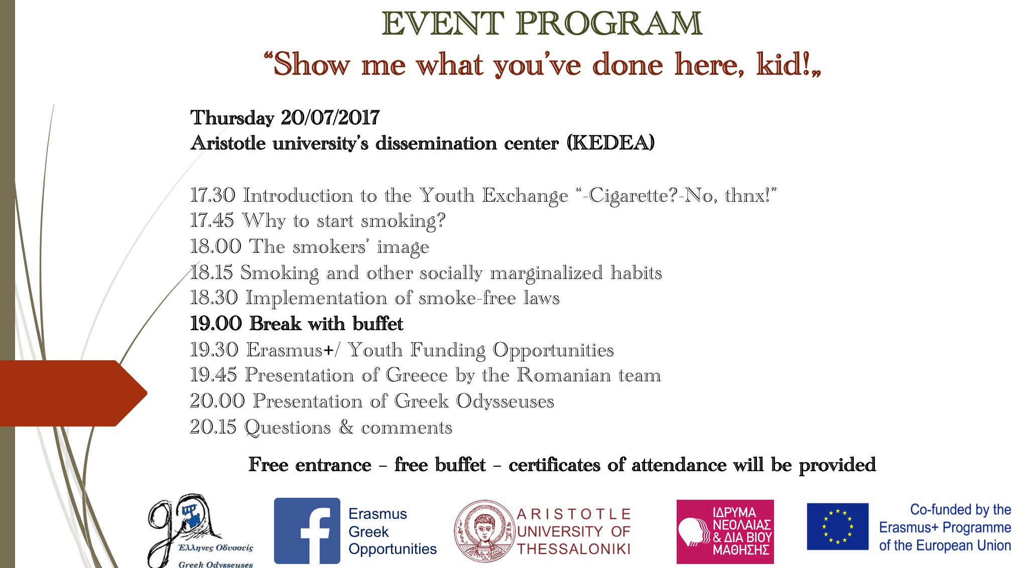 Στόχος της πολυπολιτισμικής μας εκδήλωσης είναι να ενημερωθείτε διαδραστικά για το κάπνισμα μέσα από την παρουσίαση των αποτελεσμάτων της Ανταλλαγής Νέων “-Cigarette?-No,thnx!” και να γνωρίσετε τον υπέροχο κόσμο των Youth Exchanges (επιδοτούμενων Ανταλλαγών Νέων) των ευρωπαϊκών προγραμμάτων Erasmus+!