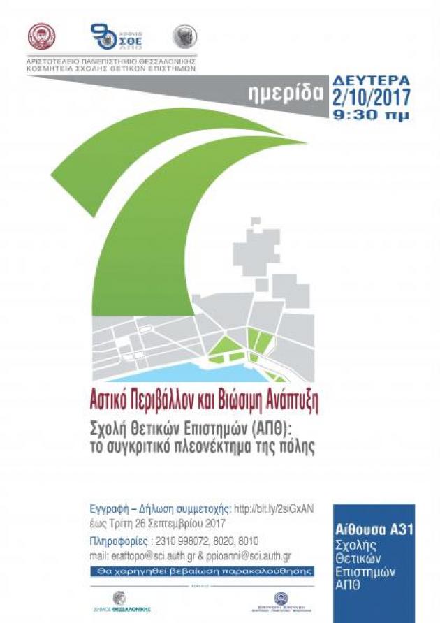 Η Κοσμητεία της Σχολής Θετικών Επιστημών του Α.Π.Θ., στο πλαίσιο εορτασμού των 90 χρόνων της Σχολής,  διοργανώνει ημερίδα με θέμα «Αστικό Περιβάλλον και Βιώσιμη Ανάπτυξη», η οποία θα πραγματοποιηθεί τη Δευτέρα 2 Οκτωβρίου 2017, ώρα 10:00 π.μ. στην αίθουσα Α31 στον 1ο όροφο του κεντρικού κτηρίου της Σ.Θ.Ε.