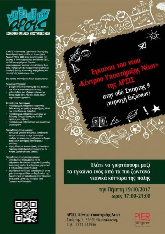 Σας προσκαλούμε στα ΕΓΚΑΙΝΙΑ του Κέντρου Υποστήριξης Νέων της ΑΡΣΙΣ, τα οποία θα πραγματοποιηθούν την Πέμπτη 19/10 από τις 17:00 έως τις 21:00.